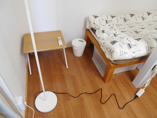 全個室にベッド、エアコン、テーブル、照明、ゴミ箱引き出し付きです。